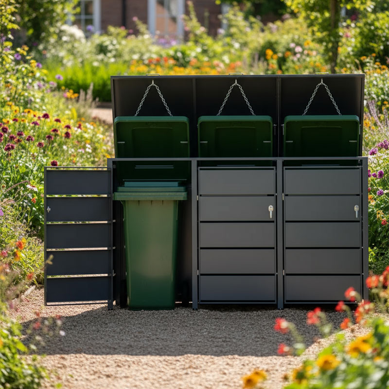 Vos trois bacs de 240L alignés devant la maison, c’est fonctionnel mais franchement pas glamour. Entre les couvercles qui claquent au vent, les sacs qui dépassent et l’odeur qui s’échappe en été, vos poubelles gâchent l’esthétique de votre entrée et agacent probablement vos voisins. Ce cache-poubelle triple-compartiment résout tous ces problèmes avec sobriété… et à prix malin !