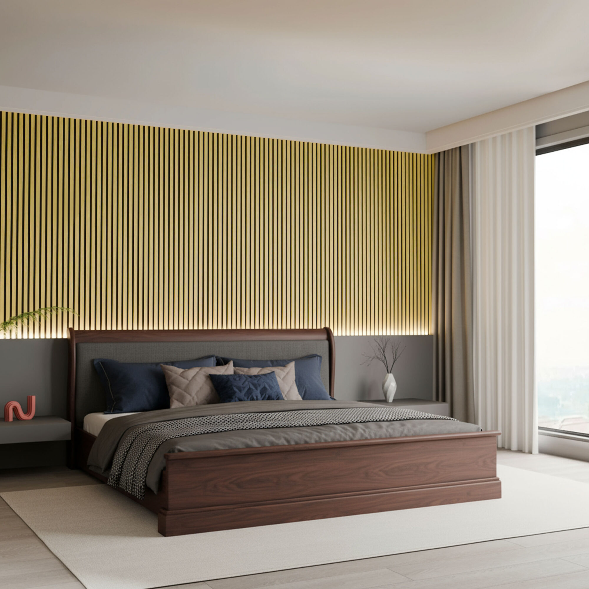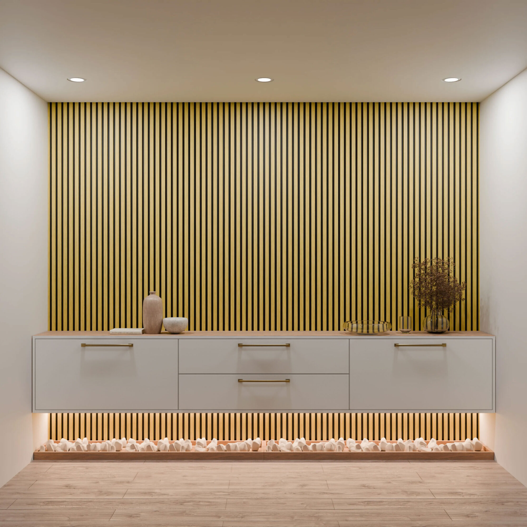 Par-dessus, 12 mm de lattes MDF habillées d’un vrai placage chêne (et non un simple un décor imprimé !). Le chêne apporte cette touche chaleureuse et rustique, avec un grain de bois qui accroche la lumière selon l’angle.