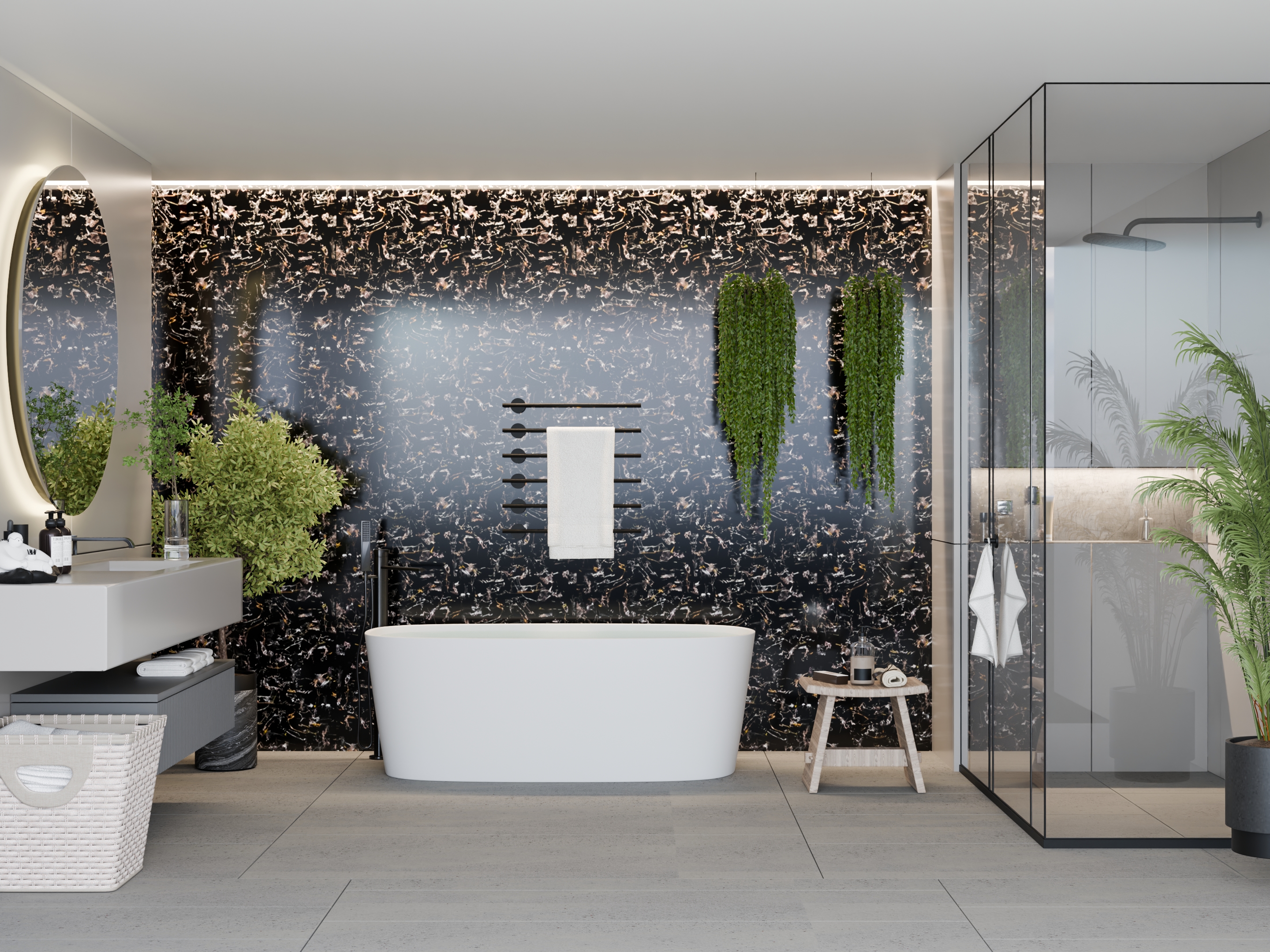 Apportez une touche élégante et contemporaine à vos murs avec ce panneau PVC effet marbre noir brillant aux veines blanches irrégulières. Léger, résistant et 100 % imperméable, il est idéal pour la salle de bain, la cuisine et tous les espaces humides.